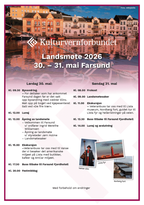 Vi ønsker alle våre medlemsorganisasjoner hjertelig velkommen til Kulturvernforbundets landsmøte 2026! Landsmøtet finner sted på Farsund Fjordhotell 30.–31. mai 2026.